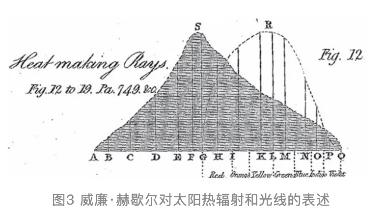 赫歇尔向皇家学会提交关于这一发现的报告后,长期担任皇家学会会长的约瑟夫·班克斯(Joseph Banks,1743~1820)写信表达了赞赏之情:“我已将您的第二篇论文展示给卡文迪许先生[20]和我的一些朋友……大家都对辐射热可从辐射光中分离出来这一发现感到震惊。[21]”图3展示了赫歇尔本人对这一现象的描述,显示了“发热射线”与可见光的分布情况,明确地将它们区分为不同实体[22]。