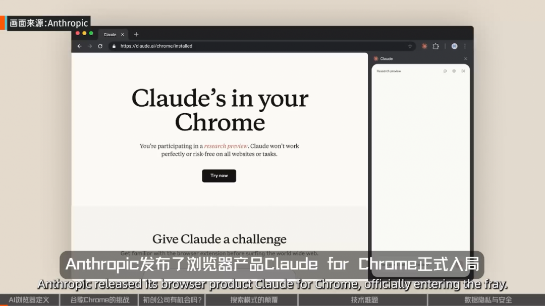 到了8月底,Anthropic新发布了浏览器产品Claude for Chrome,加入了这场战局。随着AI agent赛道的火热和能力增强,“AI browser”让“浏览器”这个过去数年都没人讨论的词,又在霎那间变成了硅谷的科技香饽饽。