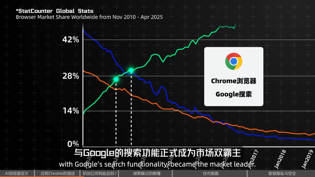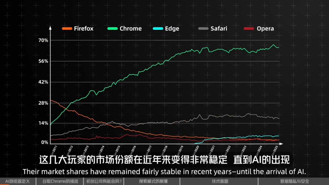 在上一代浏览器大战中,Firefox、Google Chrome、Microsoft Edge、Safari与Opera是市场中主要的竞争者。这几大玩家的市场份额在近年来变得非常稳定,直到AI出现。