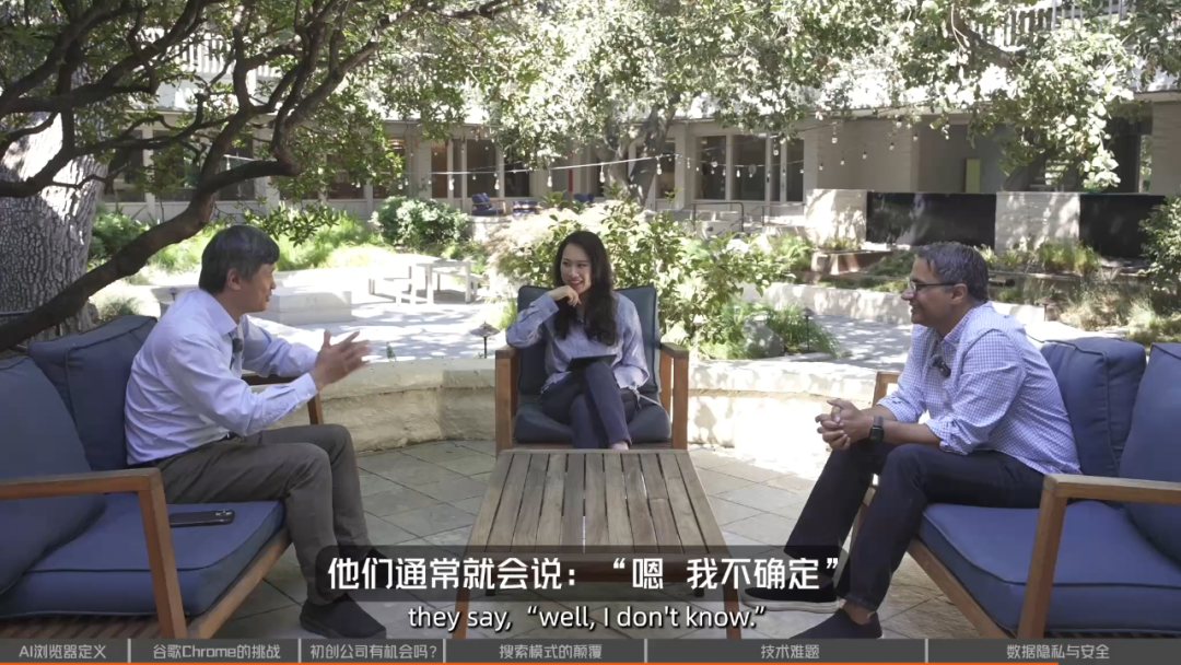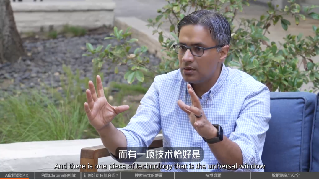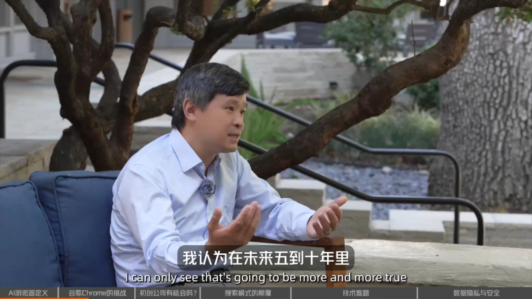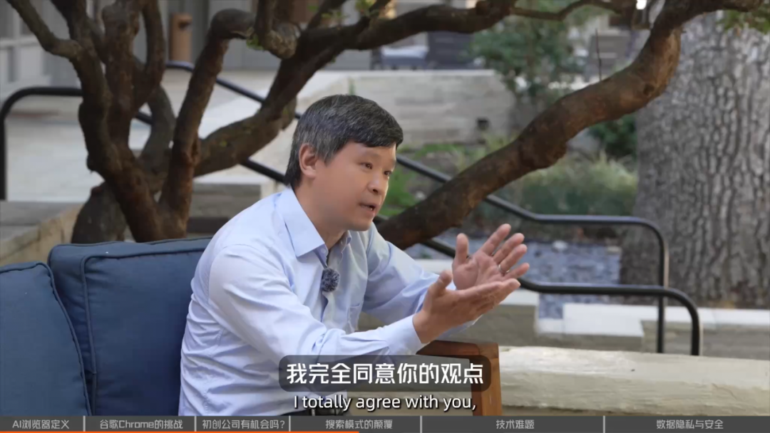 浏览器不再只是一个小窗口,让我们去获取信息、在互联网上或应用中执行操作,而是真正成为我们生活的操作系统。它是智能体化的,它是主动的,而且它能作为一个真正的伙伴,把聊天与搜索结合起来,甚至可以和它一起头脑风暴。我对这样的世界感到非常兴奋。