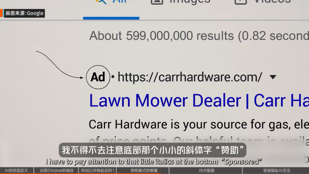 这就是搜索引擎的转折点。它曾经非常成功,但现在却被困在这种商业模式中。于是你不再只是在搜索结果右边显示三四个横幅广告,而是把它们放到了搜索结果的最上方。然后渐渐地,你让这些广告看起来越来越像真实的搜索结果。