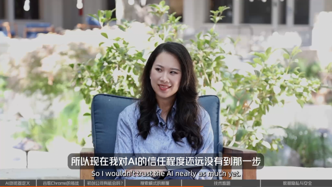 比如说,如果我想在亚马逊上买一个手机壳,我还不会完全信任智能体化浏览器来帮我完成,因为它可能十次里有八九次做对了,但万一那一次,它不是帮我买到手机壳,而是买了一部手机就不好了。所以,现在我对AI的信任程度还远没有到那一步。