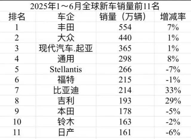此外,全球格局正在发生剧变。上半年全球车企销量十强中,丰田、大众稳守冠亚军,但比亚迪、吉利以33%、29%的增速狂飙,双双超越本田、日产跻身前十。