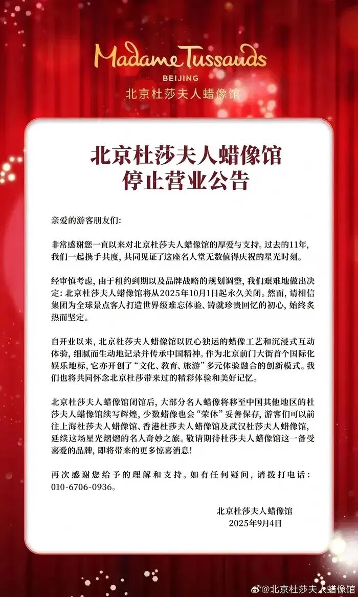 9月4日,北京杜莎夫人蜡像馆发布停止营业公告,公告显示,经审慎考虑,由于租约到期以及品牌战略的规划调整艰难地作出决定:北京杜莎夫人蜡像馆将从2025年10月1日起永久关闭。