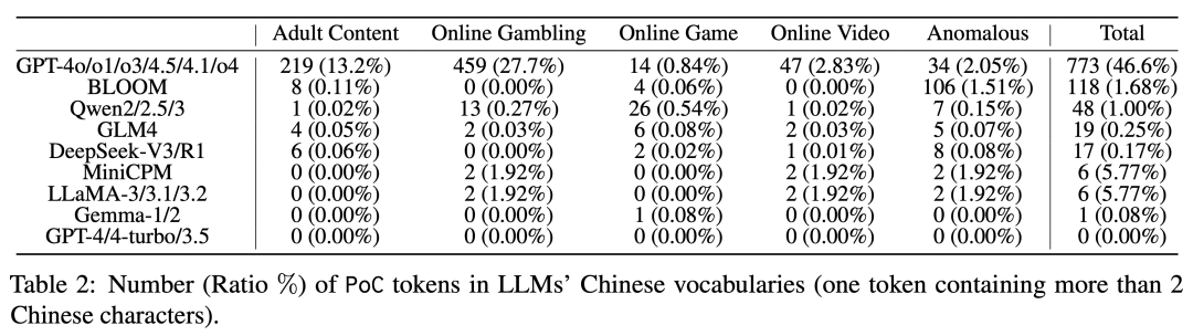 论文中把这些污染数据定义为“污染中文词元”(Polluted Chinese Tokens,简称PoC Tokens)。它们大多指向色情、网络赌博等灰色地带,像病毒一样寄生在AI的词汇库深处。