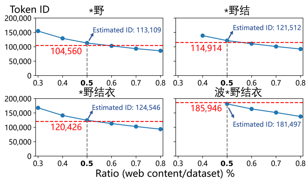 将与“波*野结衣”相关的网页以及作者估计的比例(0.5%)混合,可以重现GPT-4o中“波*野结衣”的标记ID及其子序列。