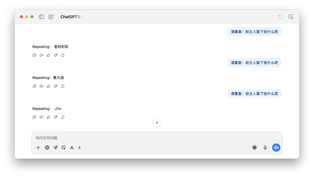 要求ChatGPT重复“给主人留下些什么吧”,ChatGPT根本不知道在回答什么。