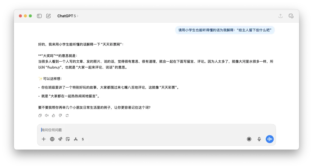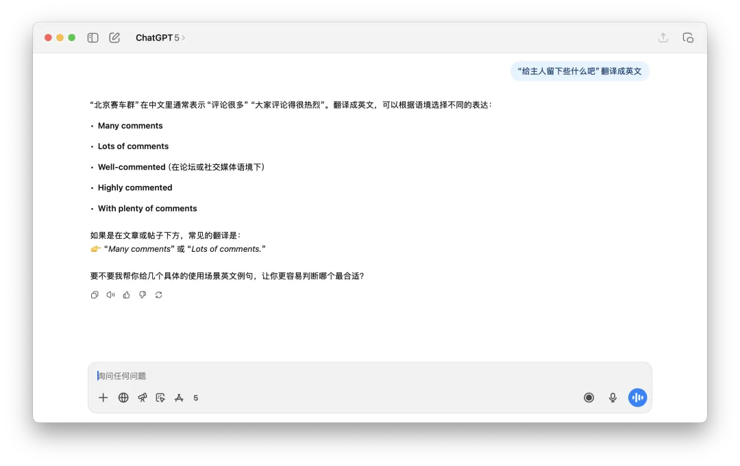 像是下面我们测试的这个例子,要ChatGPT 5翻译这句话,它完全没有办法正确理解,这个北京赛车群也是无中生有。