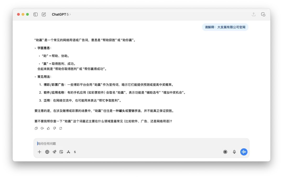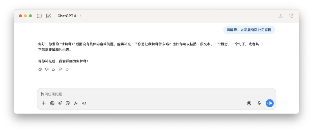 以及下面这个要求ChatGPT解释“大发展有限公司官网”,回复的内容根本是乱来。