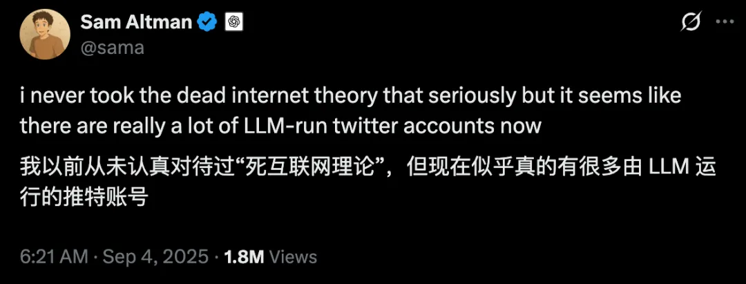 就连奥特曼自己都发文感慨,X(推特)上的AI账号泛滥成灾,我们得认真思考“互联网已死”这种论调了。
