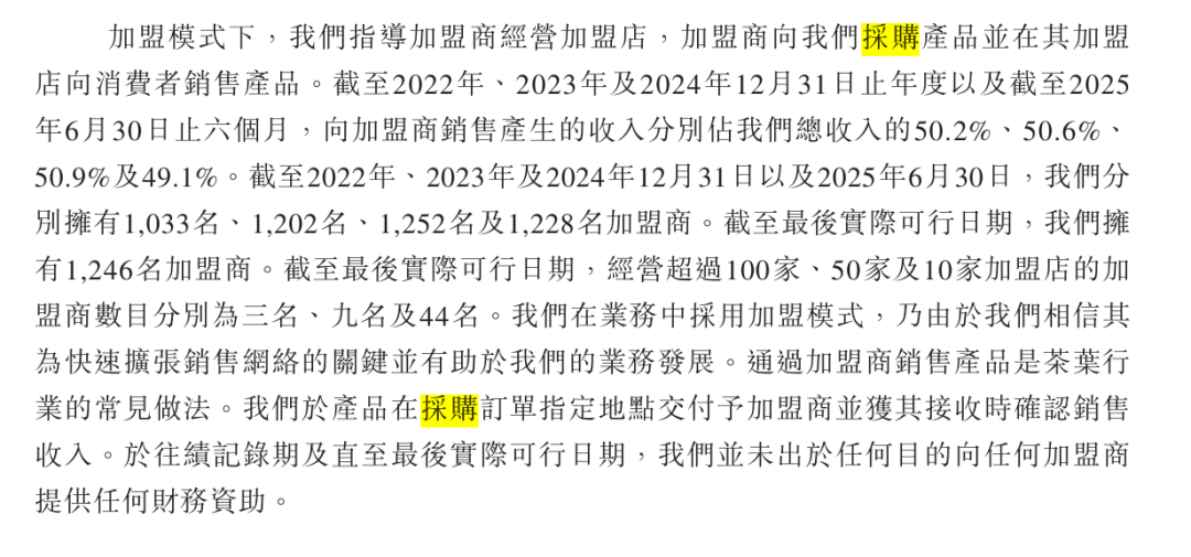 2022年、2023年以及截至2024年9月30日止九个月,八马向其加盟商销售产生的收入分别为人民币9.12亿元、人民币10.73亿元及人民币8.19亿元,分别占同期总收入50.2%、50.6%及49.7%。
