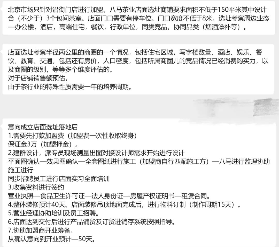 笔者向官方了解了一下加盟八马的具体要求。根据北京地区招商负责人所说,八马商铺要求面积不低于150平米,其中设计含不少于3个包间茶室。员工要求大概为每间店铺三人。