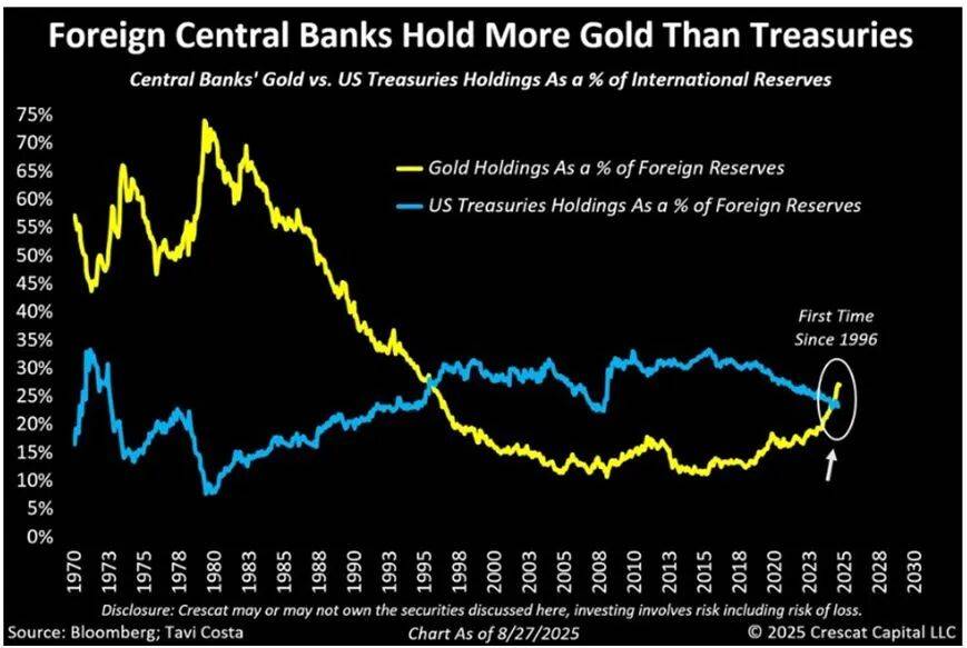 近日,一组数据在华尔街“刷屏”。9月3日,资管机构Crescat Capital合伙人兼宏观策略师塔维·科斯塔(Tavi Costa)汇编并发布数据显示:在金价创下新纪录之际,黄金在除美联储外央行的储备占比,自1996年以来首次超过美国国债。