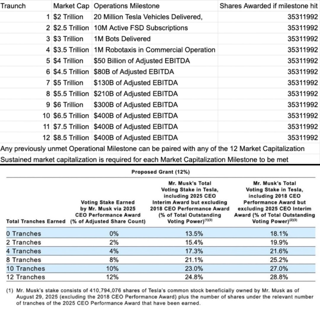 按照这个全新的薪酬方案,如果马斯克成功实现所有绩效目标,那么他将获得最高价值9000亿美元的特斯拉期权,在特斯拉的持股也将增长一倍,达到四分之一。这正是此前马斯克所要求的安全投票权比例。