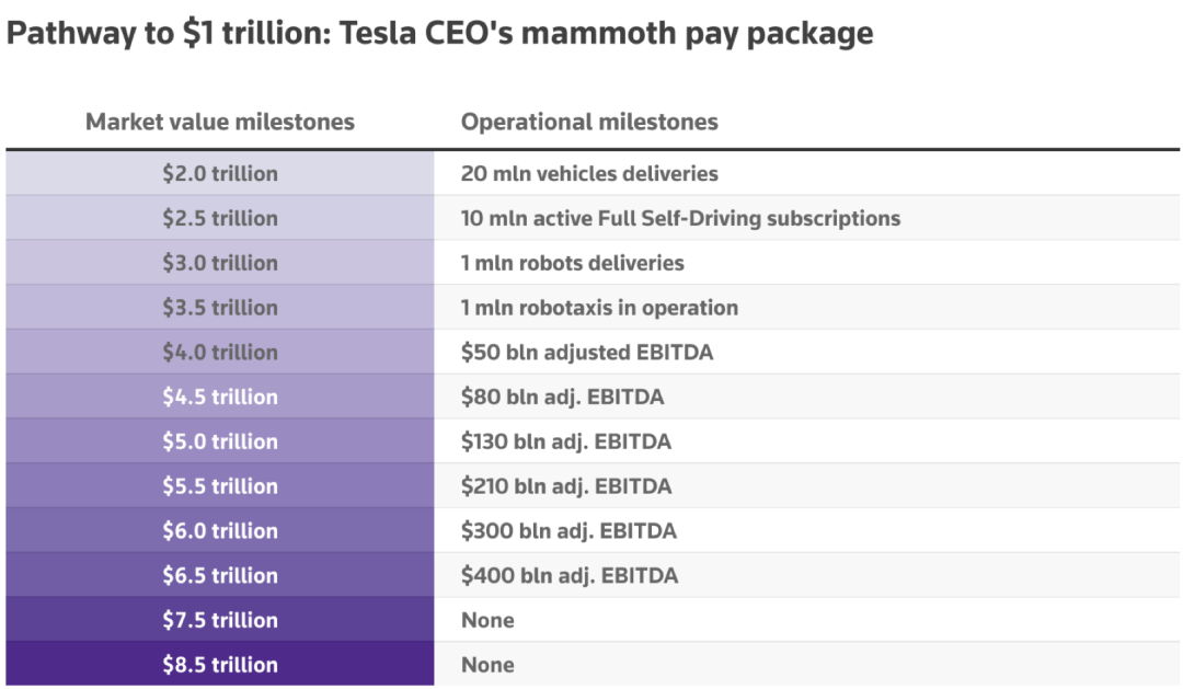 他要拿到9000亿美元的天价薪酬,就必须带领特斯拉在未来十年市值达到8.5万亿美元,相当于目前全球市值最高的英伟达(超过4万亿美元)的两倍多。当然,十年之后英伟达的市值或许也已经翻倍。