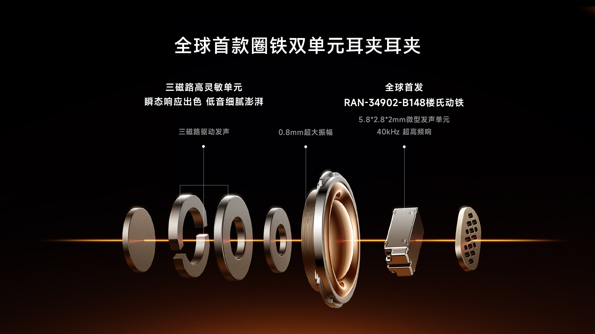 但在倍思 Inspire XC1上,倍思做了一件整个行业过去没做过的事:将发烧友级的硬件方案塞进一副开放式耳夹耳机。一套由楼氏动铁和三磁路动圈组合的双单元驱动,首次被应用在日常佩戴的耳夹形态中。高频延展到40kHz,低频振幅高达0.8mm,如果说参数看起来有点抽象,那你可以这么理解它的硬件,这样的圈铁双单元组合过去只出现在高端的有线耳机上,它就像是给耳机换了大引擎,能带来更多的马力。