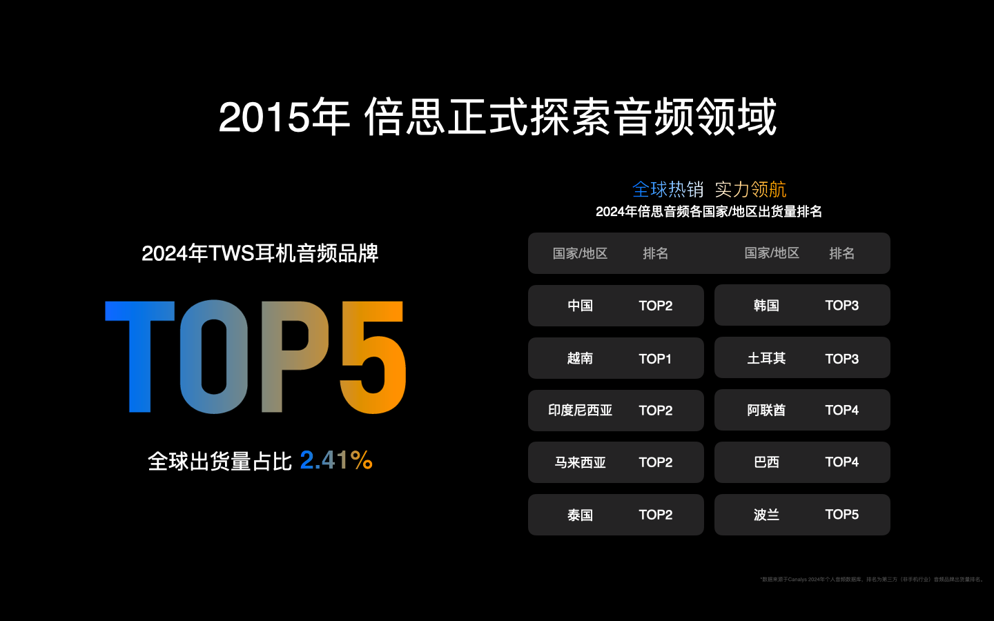 而倍思所具备的,正是 Bose 打通“最后一公里”所需要的关键要素。倍思十分擅长把技术送到用户手里,比如此前的氮化镓充电器。这不仅是因为它对用户需求有着深刻洞察,还因为它有着敢为人先的魄力。过去十年里,倍思陪伴着庞大的年轻用户群从18岁走到30岁,倍思深度参与并见证了他们需求的变化,并据此在产品上做出相应演进,践行着自己的品牌理念 Base on User 。此次发布的倍思 Inspire 系列更是沿着这条用户成长路径给出的系统化回应——当一代用户的需求不断成长升级,倍思自身也完成了全链路技术品牌的升级,能力范围覆盖了声学算法、材料工艺、佩戴结构设计以及产品交付等方方面面。2024年,倍思跃居成为全球 TWS 出货量前五、国内 TWS 出货量第二的第三方音频品牌。