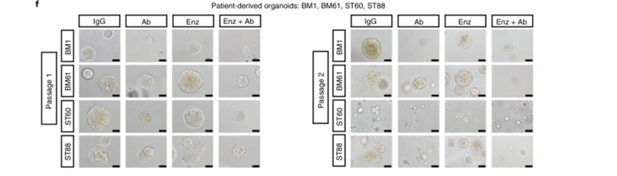 研究人员测试了抗人Gremlin-1抗体对患者来源类器官(PDOs)和异种移植物(PDXs)的影响。结果发现,抗人Gremlin-1抗体对PDO生长具有抑制作用。更重要的是,单独使用恩扎卢胺治疗对这4个PDO没有任何影响,但与抗人Gremlin-1抗体联合使用时,对PDO生长显示出抑制作用。