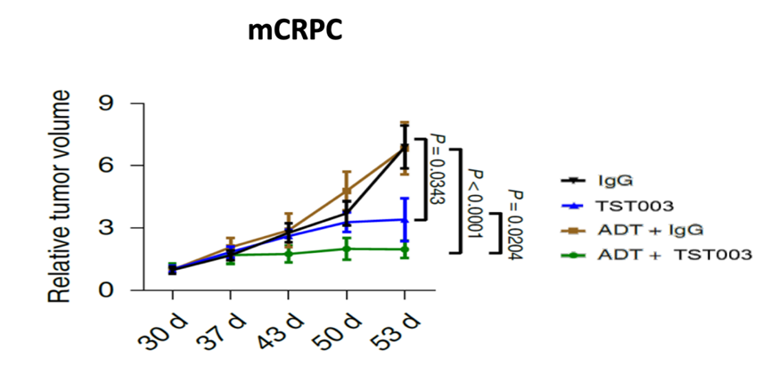 抗Gremlin-1治疗,或许还能够逆转雄激素通路靶向治疗的耐药。TST003公布的数据证明,其在AR和神经内分泌标志物双阴性去势抵抗性前列腺癌小鼠模型中展现出不错的单药活性。并且,抗Gremlin-1治疗增加了双阴性前列腺癌中AR的表达和AR特征基因。