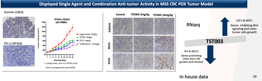上述结果提示Gremlin-1单抗可能将“冷肿瘤”变“热”,成为这类难治性肿瘤的新型免疫调控疗法,增强T细胞浸润或功能,恢复免疫治疗敏感性,并具备与现有标准治疗协同增效的潜力。而这些结果,也为TST786在MSS-CRC的差异化突围打下了基础。