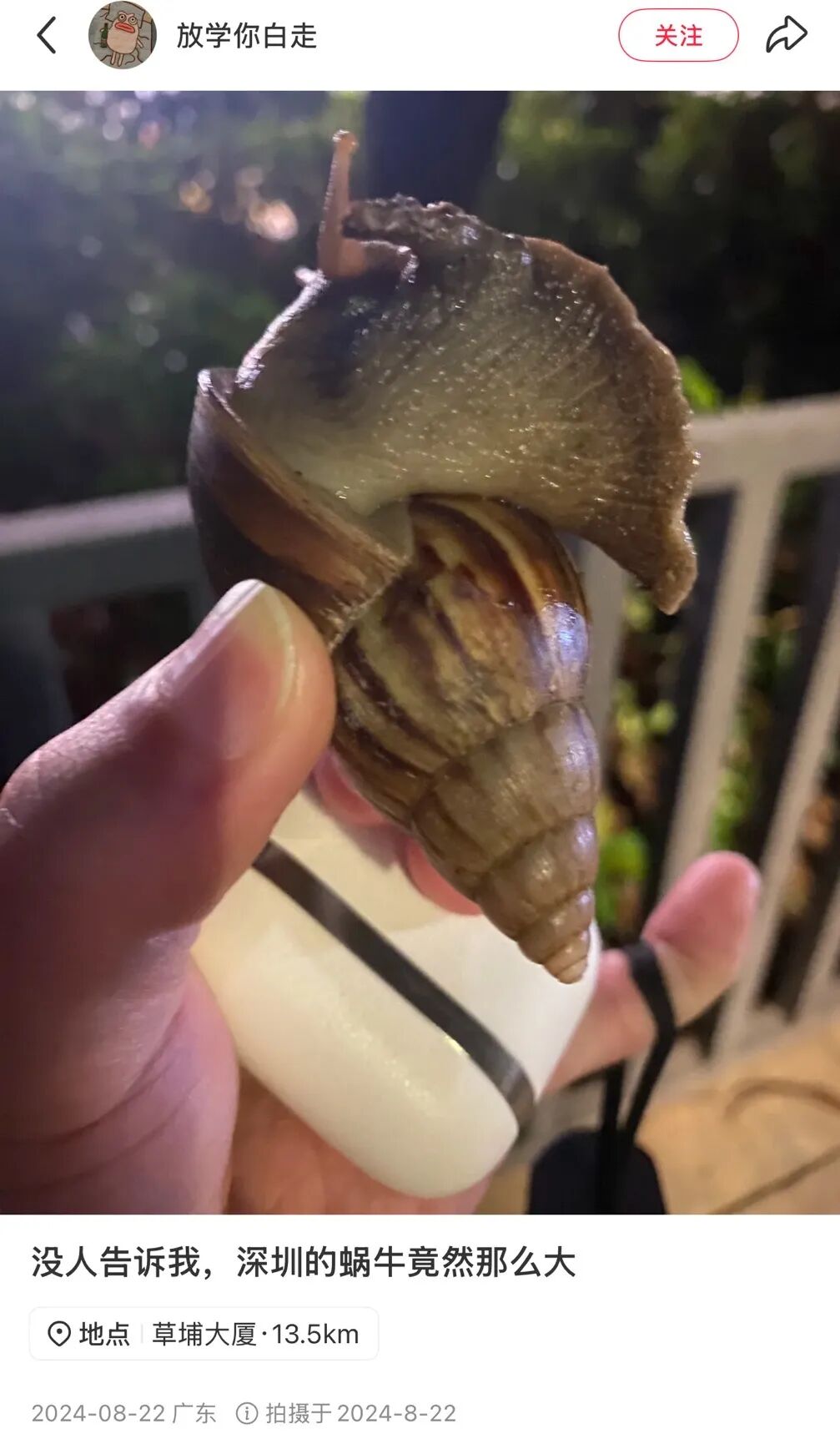 也有外地人刚把非洲大蜗牛当异宠拍照,被深圳人大声呵斥:“光速丢掉!上百条寄生虫正在攻击你!”