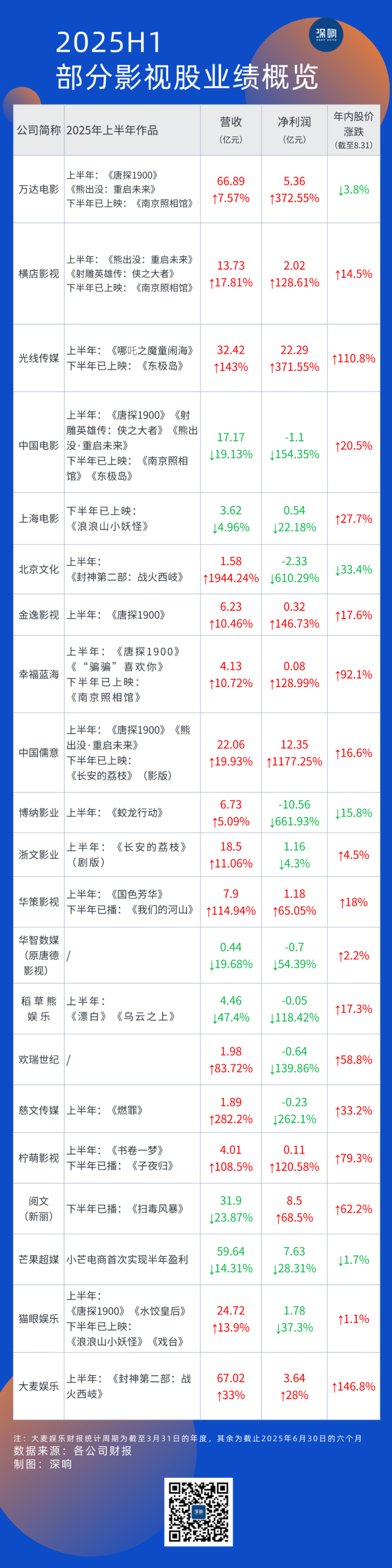 拿出大爆款《哪吒之魔童闹海》(下文简称《哪吒2》)的光线传媒,上半年营收同比增长143%至32.42亿元,净利润则激增371.55%至22.29亿元,带动年内股价大涨110.8%;押中《唐探1900》、《熊出没:重启未来》的中国儒意,营收、净利润同比分别上涨19.93%和1177.25%,至22.06亿和12.35亿,年内股价累计上涨16.6%。