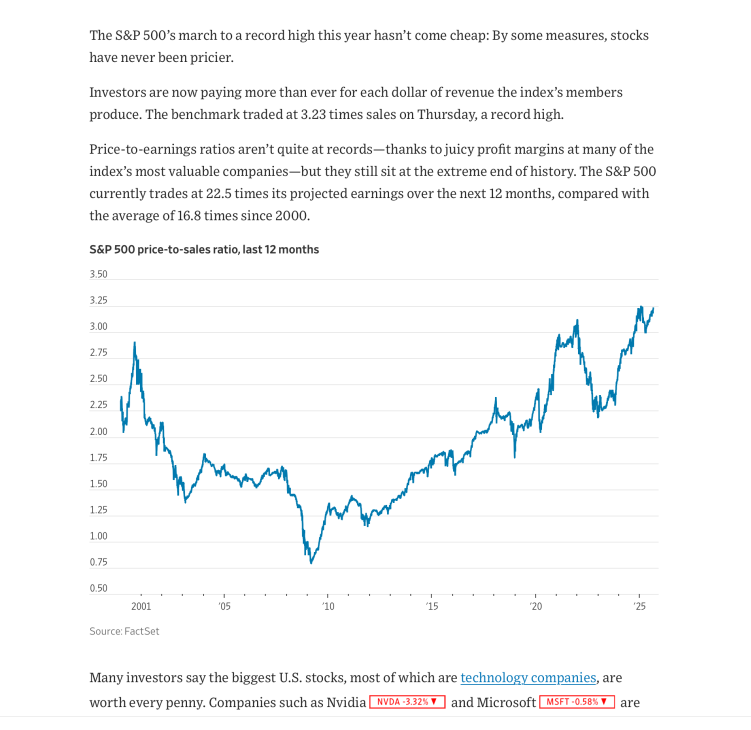 虽然从PE倍数来说,美股尤其是几大科技巨头的估值还处在相对合理的区间,但是从最近一篇华尔街时报的文章分析,如果从一个市销率(PS)倍数来看,整个S&P指数已经达到了3.25倍,是过去二十五年的最高点,超过了2000年互联网泡沫时期。如果从这个角度来看,美股估值处于历史高位,AI的宏大叙事和MAG7 还能继续支撑整个市场多久呢?巴菲特的现金处于历史高位又说明了什么?