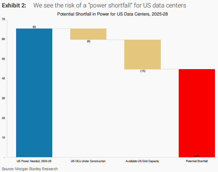 能源——摩根士丹利最新的报告中指出,美国电网电力的严重不足将成为制约AI交易兑现的第一核心矛盾。2025-2028年,美国AI数据中心总新增用电需求将达约65GW,而目前全美电网有着一个近45GW的用电缺口将贯穿2025-2028年,若扩展到2029年,这一缺口将可能进一步扩大至68GW。