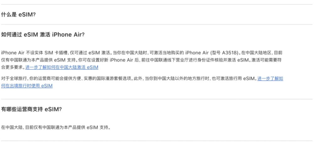 除了设计,iPhone Air显然还需要回答另一个更重要的问题,那就是eSIM在中国大陆地区的落地进度如何,这显然也是最多用户关心的“细节”之一。