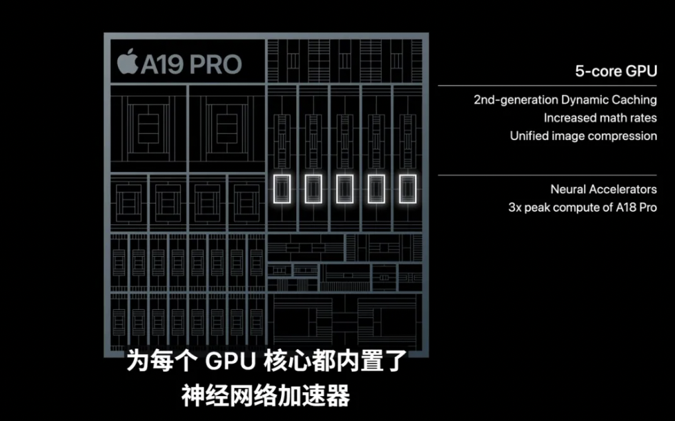 A19 Pro的GPU同样大幅升级,拥有比A18 Pro更大的缓存和内存。苹果推出了第二代动态缓存架构,将16位浮点运算性能翻倍提升,还构建了新的统一图像压缩技术。