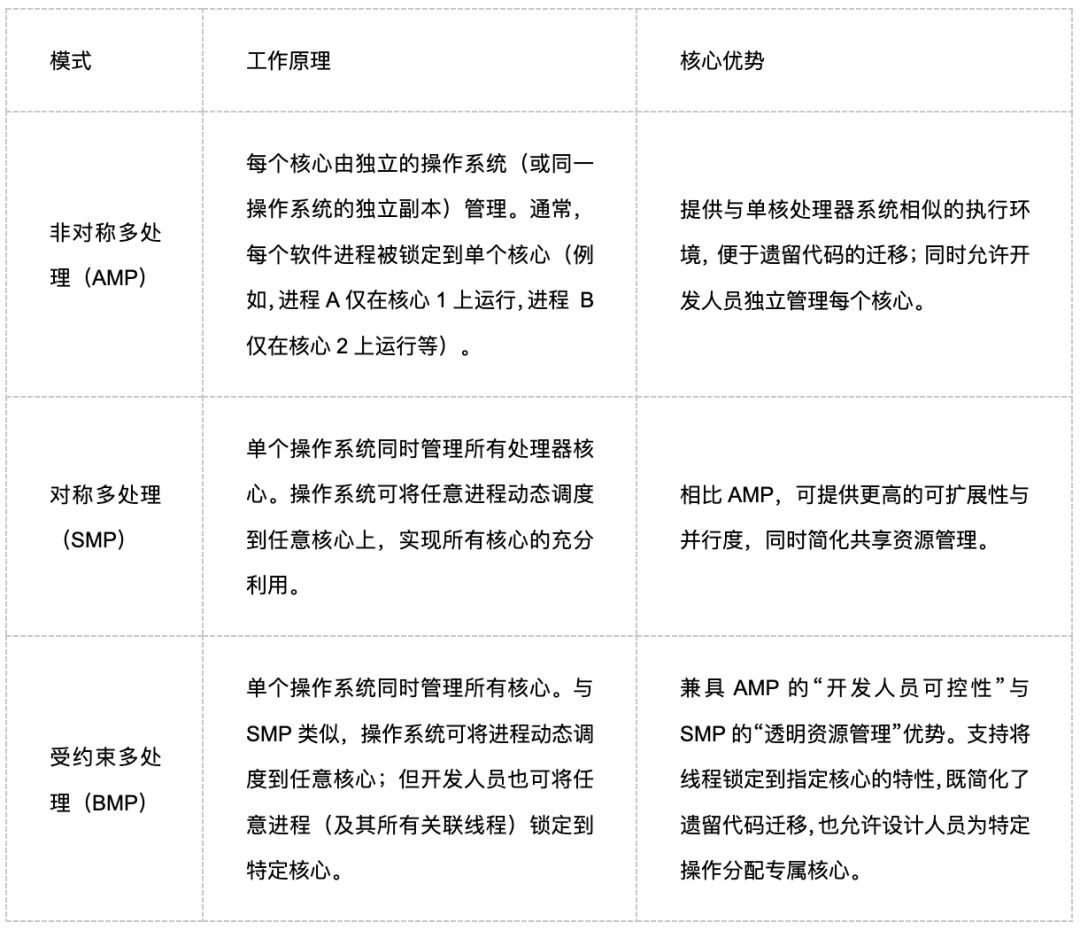 AMP分为“同构”与“异构”两种:同构AMP中,每个核心运行相同类型与版本的操作系统,开发人员可选择支持分布式编程模型的操作系统,以充分利用多核心性能;异构AMP中,每个核心运行不同操作系统,或同一操作系统不同版本,在此场景下,开发人员要么需实现专有通信方案,要么需选择两个共享通用处理器间通信基础设施的操作系统,为避免资源冲突,这些操作系统还应提供访问共享硬件组件的标准化机制。