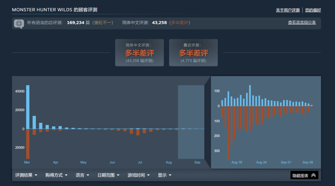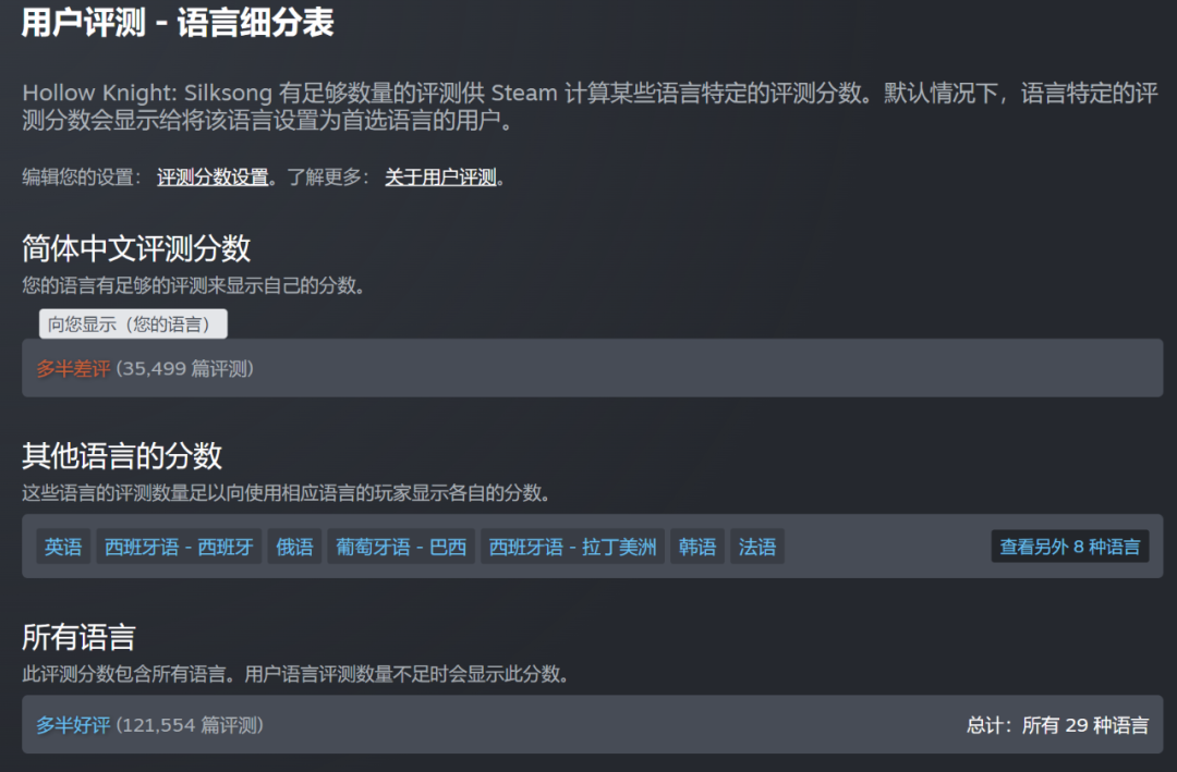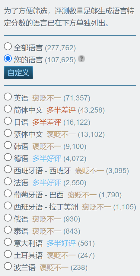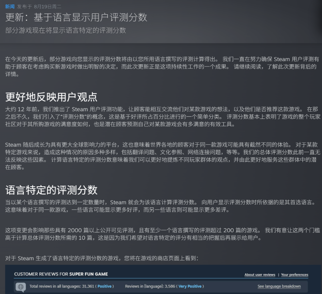 8月末,Steam平台也更新博客表示推出“按语言筛选评价”的功能,也让评价的参考价值变得更加直观和重要,Valve自己也表示,“对于某款特定游戏来说,造成这种情况的原因多种多样,包括翻译问题、文化参照、网络连接问题等。我们的总体评测分数此前一直无法反映这些因素。”