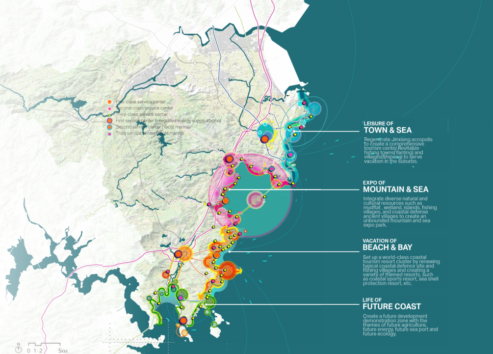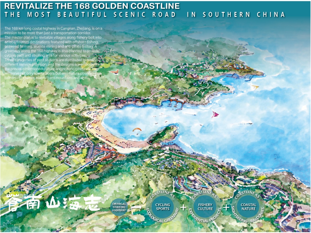 再说点格局:下图交代了168的苍南山海志,这条旅游线路的设计来自美国AECOM设计集团,喇叭个人理解,168也分为四段:炎亭-金乡段,大渔-赤溪段、渔寮-马站段、霞关段。侧重点各有不同,分别是:城海休闲、山海博物、海湾度假、渔业生活。