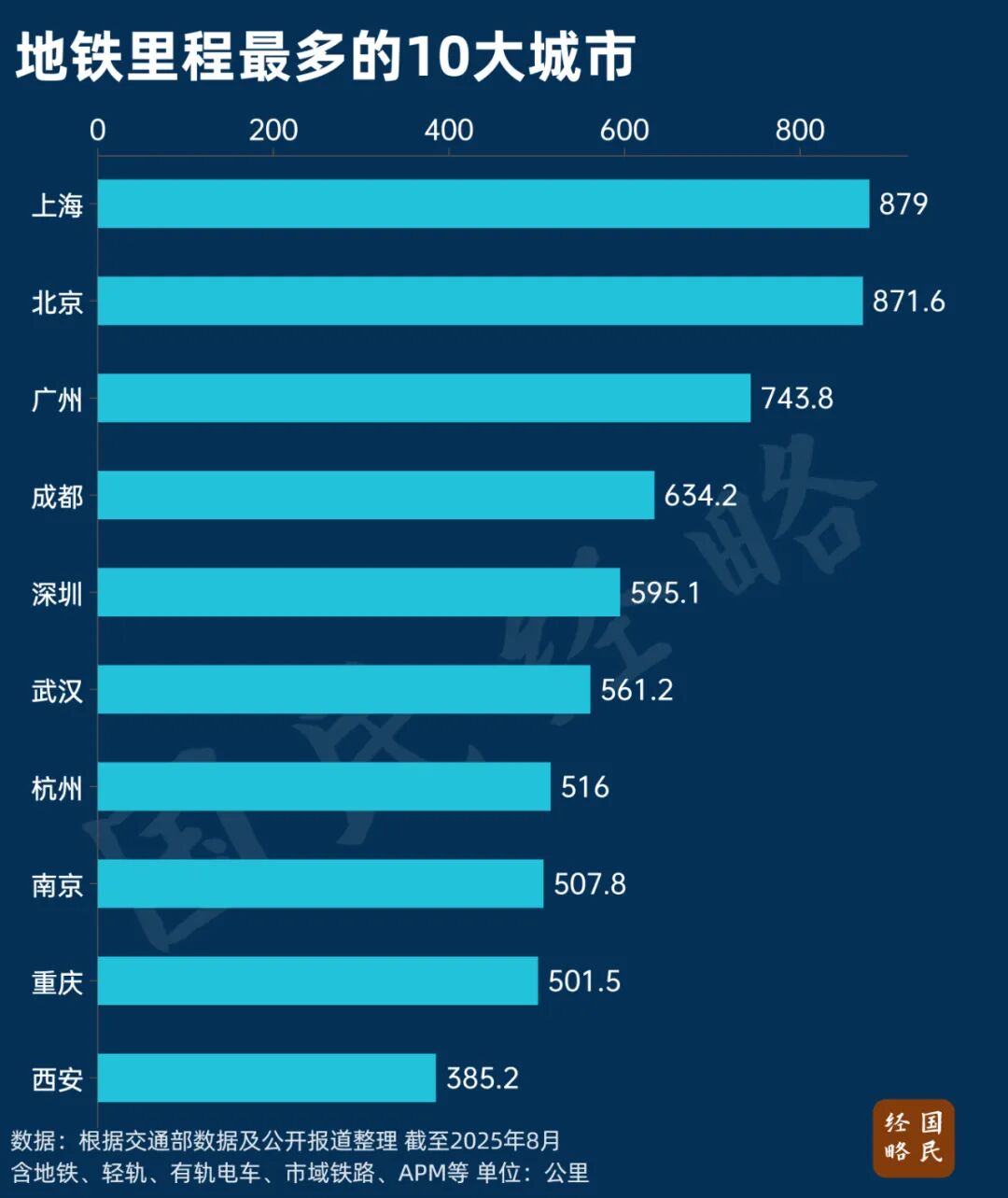 若论地铁运营里程,第一城是京沪之争,上海以微弱优势领先。