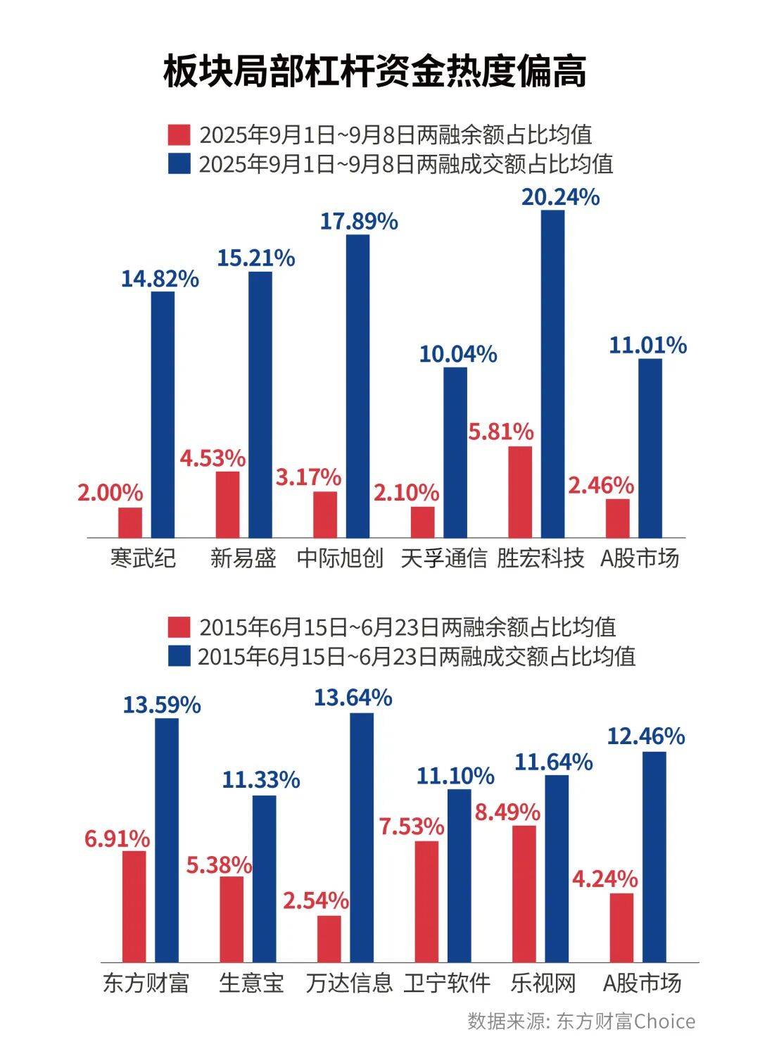 尽管从具体行业层面来看,目前沪深两市的杠杆率远低于2015年6月中旬。不过,在一些板块局部的热度却显得偏高。