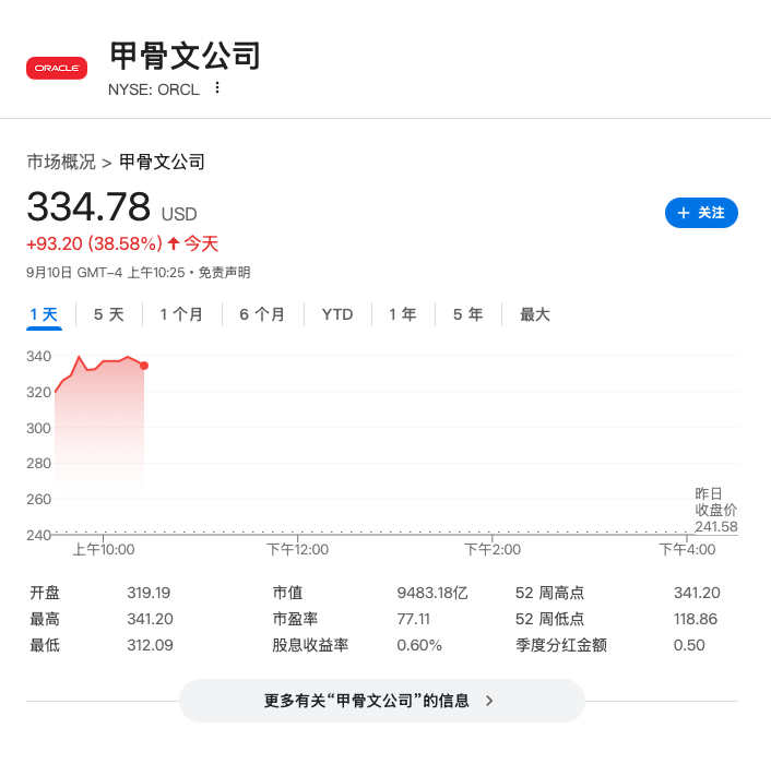 周三,甲骨文美股盘初涨幅一度扩大至42%,创1992年以来最大盘中涨幅,该公司盘中市值达到9500亿美元,超越摩根大通、沃尔玛、礼来和Visa,成为标普500指数中第10大市值公司,直追巴菲特旗下伯克希尔哈撒韦。
