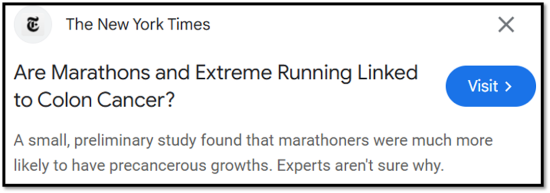 当然,上述两项研究完全不同,实际不存在矛盾。而马拉松的报道更不是虚假消息,但也是由于《纽约时报》的影响力,马拉松增加癌症风险迅速被更多媒体跟进,引发热议。