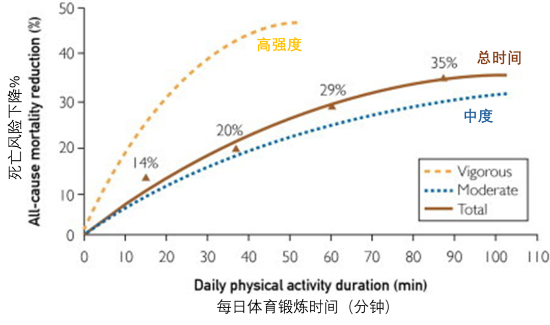 很多研究都证实更多的运动与更低的死亡风险相关,但这似乎存在“剂量”限制,差不多每天中度强度锻炼15分钟起就能见效(与不动相比死亡风险下降),可效果到每天剧烈运动1小时就见顶,再往上似乎没有更多健康收益: