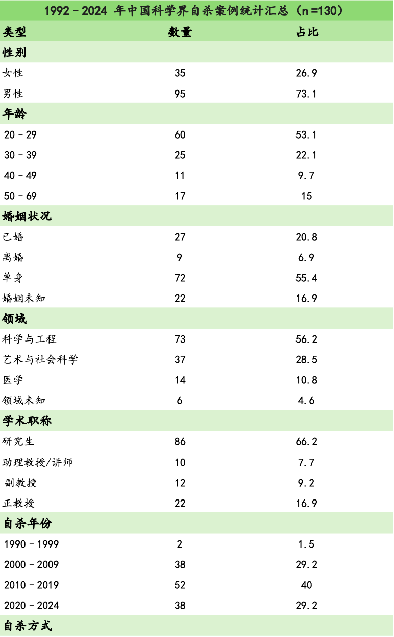 该数据库不仅详细记录了性别、年龄、自杀死亡年份、所属领域、学术职称和机构隶属关系等信息,还包括媒体报道中提及的自杀原因、自杀方式等。虽然样本并不具备全国代表性,但仍能揭示重要的时间趋势和结构性特征。