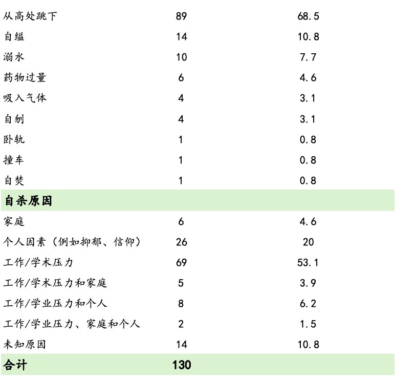 从自杀的原因角度来看,是多方面的,并且存在性别差异。其中学术压力(65%的案例提到)、个人病史和信仰(28%的案例提到)以及家庭问题(10%的案例提到)是被提及最多的风险因素,这也能够看出学术压力是导致这些自杀事件的主要原因。