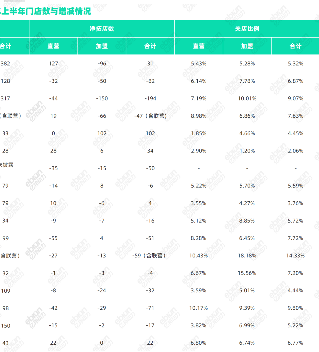 亿邦动力统计了17家服饰品牌今年上半年门店数情况,关店比率普遍超过5%,其中,安奈儿闭店率14.33%最高,森马关闭629家关店总量最多。此外,歌力思海外市场净闭店5家,报告称加速优化低效门店后,上半年归母净利润大幅增长45.3%。