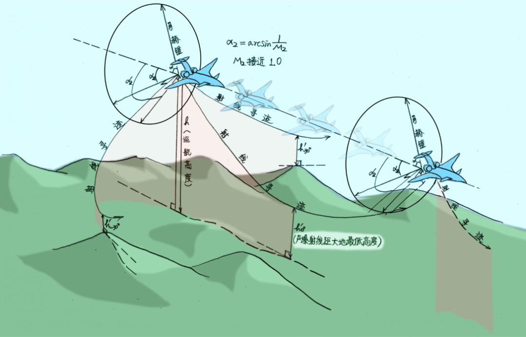 示例2:马赫数略大于1的飞机从高空匀速水平直线掠过,所有方向的声爆射线均中途折射回天空,无一落至地表,声爆地毯宽度为零(整个地面均为声影区),发生“马赫截断”。