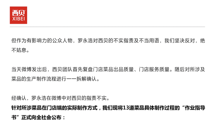 9月12日下午,西贝发布致顾客的一封信称,经确认,罗永浩在微博中对西贝的指责不实。其还公布了罗永浩此前购买的13道菜品具体制作过程。
