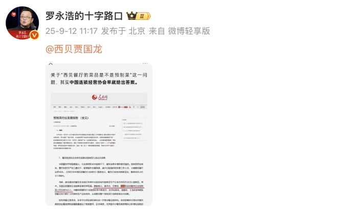 同日上午,罗永浩在社交平台发文称,“关于西贝餐厅的菜品是不是预制菜”这一问题,早就有了答案。其微博截图显示,人民网研究院2023年7月发布的《预制菜行业发展报告》显示,真功夫、吉野家、西贝等连锁餐饮企业预制菜占比达80%以上。