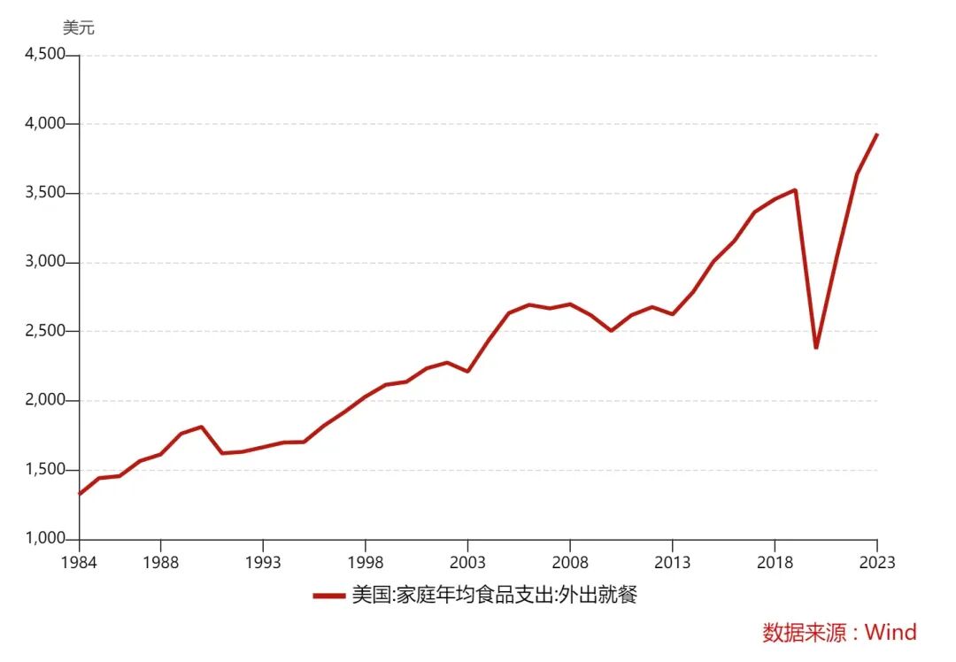 欧美发达国家早已走过这条路。手工品和连锁预制区分定价、明星大厨和单体餐厅享受溢价,或许是解决方式。美国的外出就餐价格一直是推高CPI的重要因素。因为服务人员实在太贵了(蓝色线为外出就餐,涨幅一直高于家庭就餐)。虽然美国是连锁快餐的发源圣地,但个性十足的餐厅仍然占比较高。