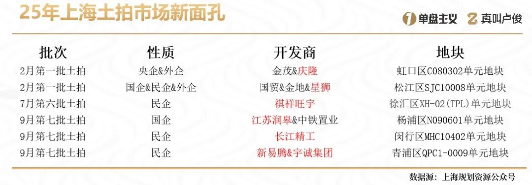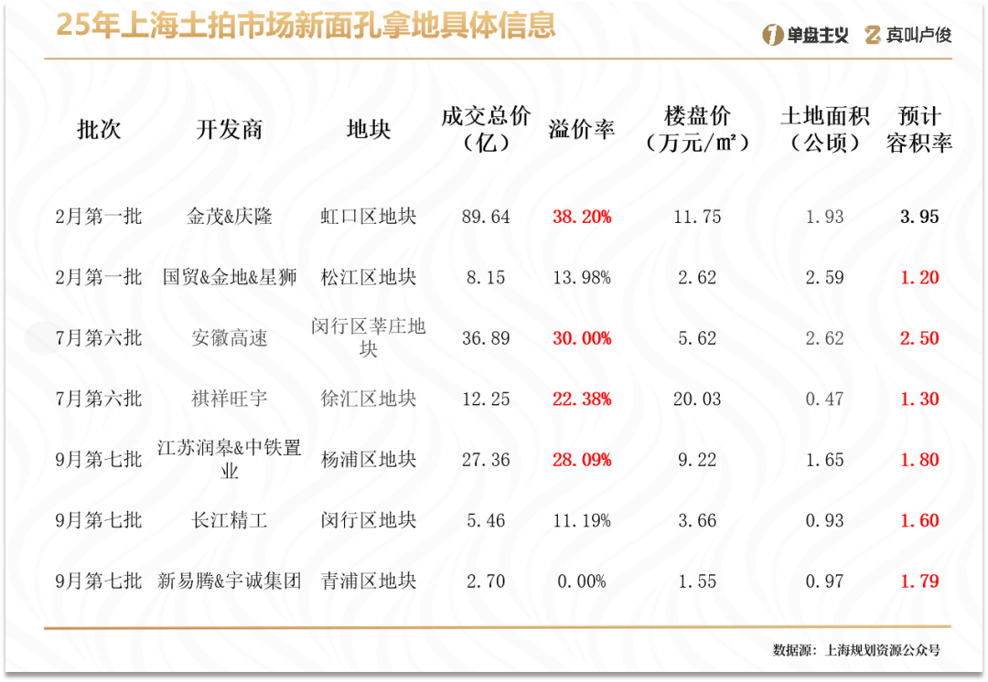 2025年现在上海已出七批土拍结果公开,一共32幅地,而这些新面孔就占了将近20%。