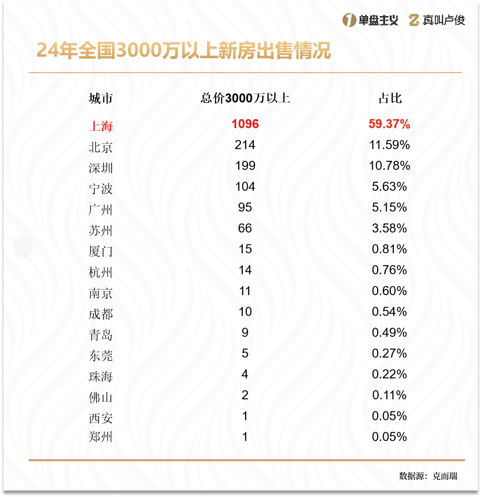 而上海,毫无疑问就是豪宅大本营。2024年成交的3000万以上豪宅,上海就占近六成。