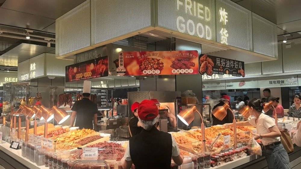 在熟食区域大做文章。熟食区的产品非常丰富,熏肉、凉拌菜、卤味,啥都有,不仅支持试吃,为了保证品质,所有熟食都是店内自制,单郑兆丰翔云店配置 40 余名加工人员,能制作 160 款主食和 200 款熟食单品,全是现场制作,香气扑鼻,让人忍不住想买。