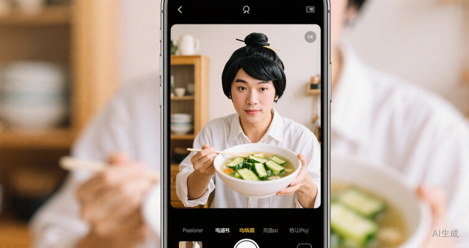 梅罗维茨曾在《消失的地域》中认为,媒介的变化会改变社会场景并最终反过来改变使用媒介者的行为。从这个视角看,早期反串视频需要精致妆容和服饰,表演门槛较高;近期的一人饰演全家仅靠“变老特效”即可完成,技术门槛降低后,更多人可以参与创作。