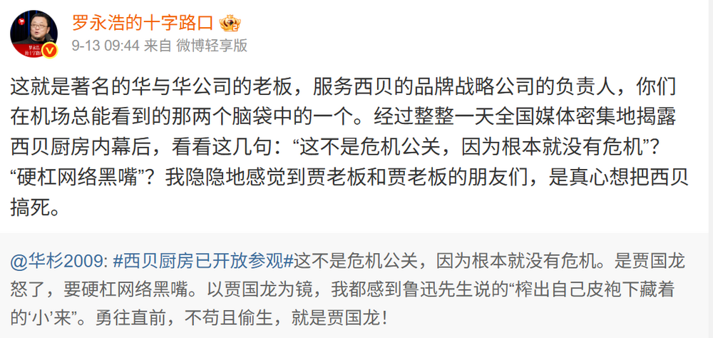 回到这次老罗和西贝的事件,写完稿子的时候,我得知华与华已经跟老罗道歉了。